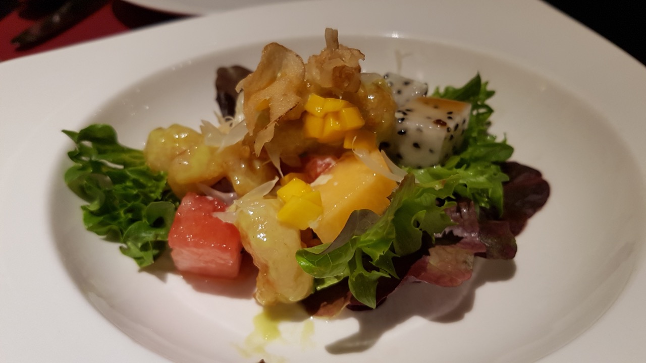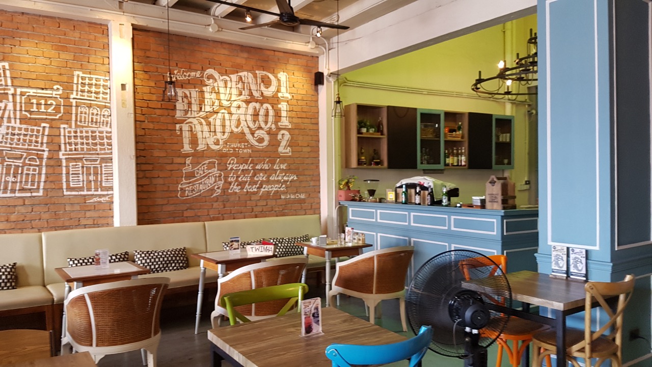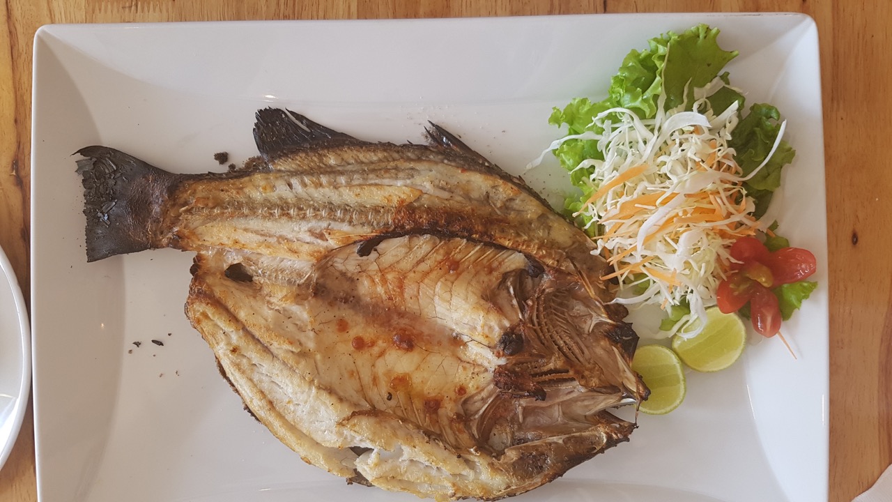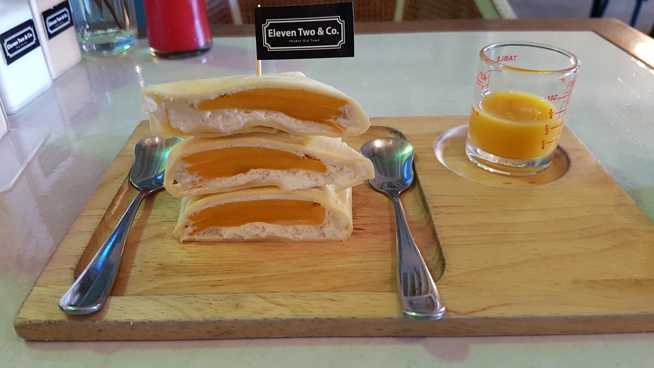 Phuket a aussi donné l’occasion de consommer ce type de plats taillés pour les européens. On va oublier les plages de cette île, où les établissements sont globalement sans grand intérêt. Je retiendrai juste un poisson bien cuisiné, et frais. Le même établissement disait cependant cuisiner aussi du surgelé. Non, retournons à Phuket Town, éloigné des plages mais pas inintéressant. Ici une pause a été faite dans un bar qui tente clairement de satisfaire un public européens aussi bien dans les réalisation des plats que par la présentation. Ainsi j’ai pris au petit déjeuner une sorte de crêpe fourrée à la mangue, avec jus de mangue et café. Clairement la présentation n’a rien de traditionnelle. L’idée était cependant originale, et le café très bon. La recette n’était cependant pas parfaite, et la mangue loin d’être la meilleure. Mais l’intention était là, et le résultat correct. Cependant il ne faudrait pas que toute la cuisine locale prenne cette direction au risque de perdre de son charme et de son attrait.