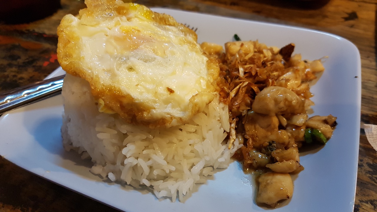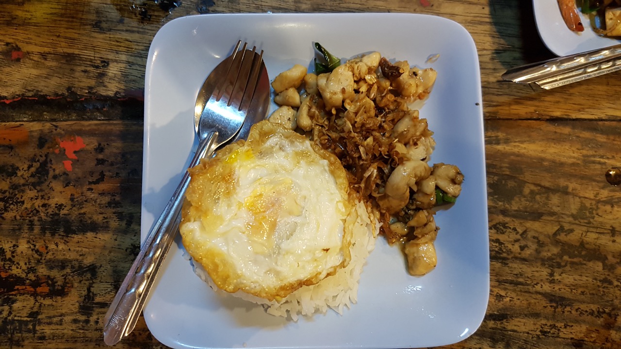 Dans nos appartements, la cuisine tient une place importante en tant que pièce à vivre. Ce n’est pas le cas en Thaïlande où cet espace est réduit. Les habitants se reportent donc sur la cuisine de rue pour leur déjeuner. Ainsi, si vous partez à l’heure où les les gens vont travailler, vous pourrez acheter à même la rue un repas à emporter dans un tupperware, couverts fournis. J’ai eu l’occasion de le faire avec un riz/poulet très réussi.