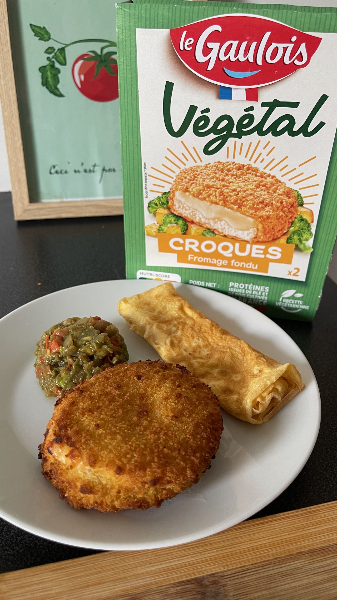 Blé et pois sont très présents dans ces recettes, on aura donc tendance à conseiller de varier son alimentation. Mais dans cette gamme, nous avons bien aimé en premier lieu le “Croque végétal“. Par le goût, il ne cherche pas à imiter ce qui se fait traditionnellement. Il est très croquant, et la touche de fromage amène du fondant rendant l’ensemble bien tendre. Pour notre part, on l’a complété d’une omelette et de quelques légumes.